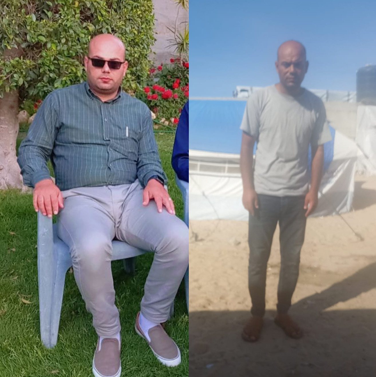 “I have lost nearly 37 kilos,” said Basel, one of the men at Shabab Gaza’s community kitchen. He showed pictures of himself from 2023, back when he used to weigh 247 pounds. Basel is bald with blue eyes, with a 6-foot, 2-inch frame. Now 165 pounds, he looks thin, his face gaunt. Several men showed pictures of this kind of transformation. They described the indignity of going hungry every day and how weakened they feel.