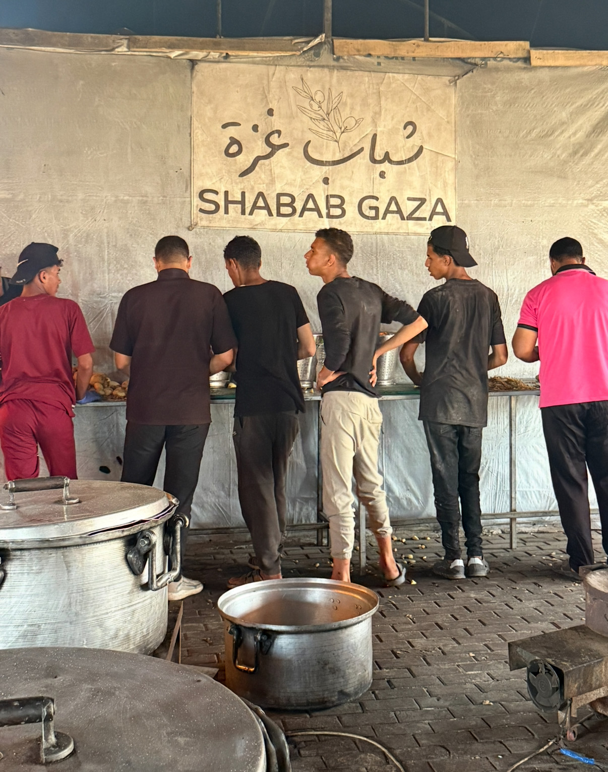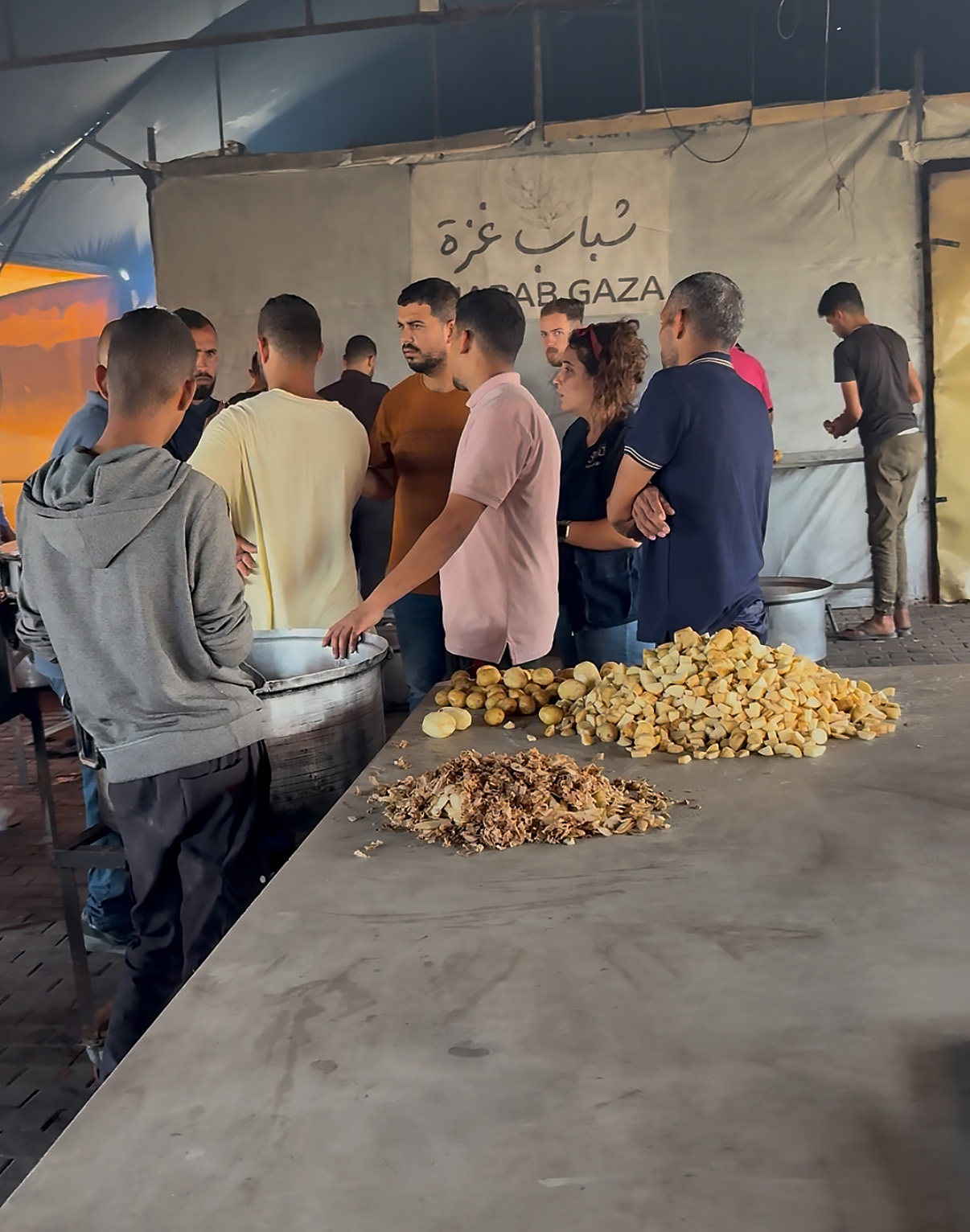 Shabab Gaza, “the youth of Gaza” in Arabic, was making meals of rice so people could break their fast at sundown. Inside a makeshift kitchen housed in a tent, the men, fasting themselves, worked in groups to cook the rice in vats. They packaged it quickly to deliver to the surrounding area, but neighbors also showed up with pots and pans, ready to grab the food for their families, or ready to eat themselves.