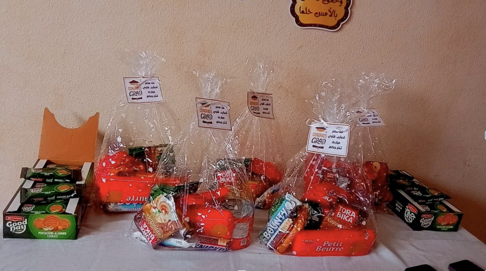 We agreed we would all arrive together after the Asr prayer. The surprise went off perfectly, with each of our guests completely caught off guard by their packages of delicious food and treats. We captured their joy with photos and videos. We played graduation songs and my Aunt Manar joined us live via WhatsApp to witness the celebration.