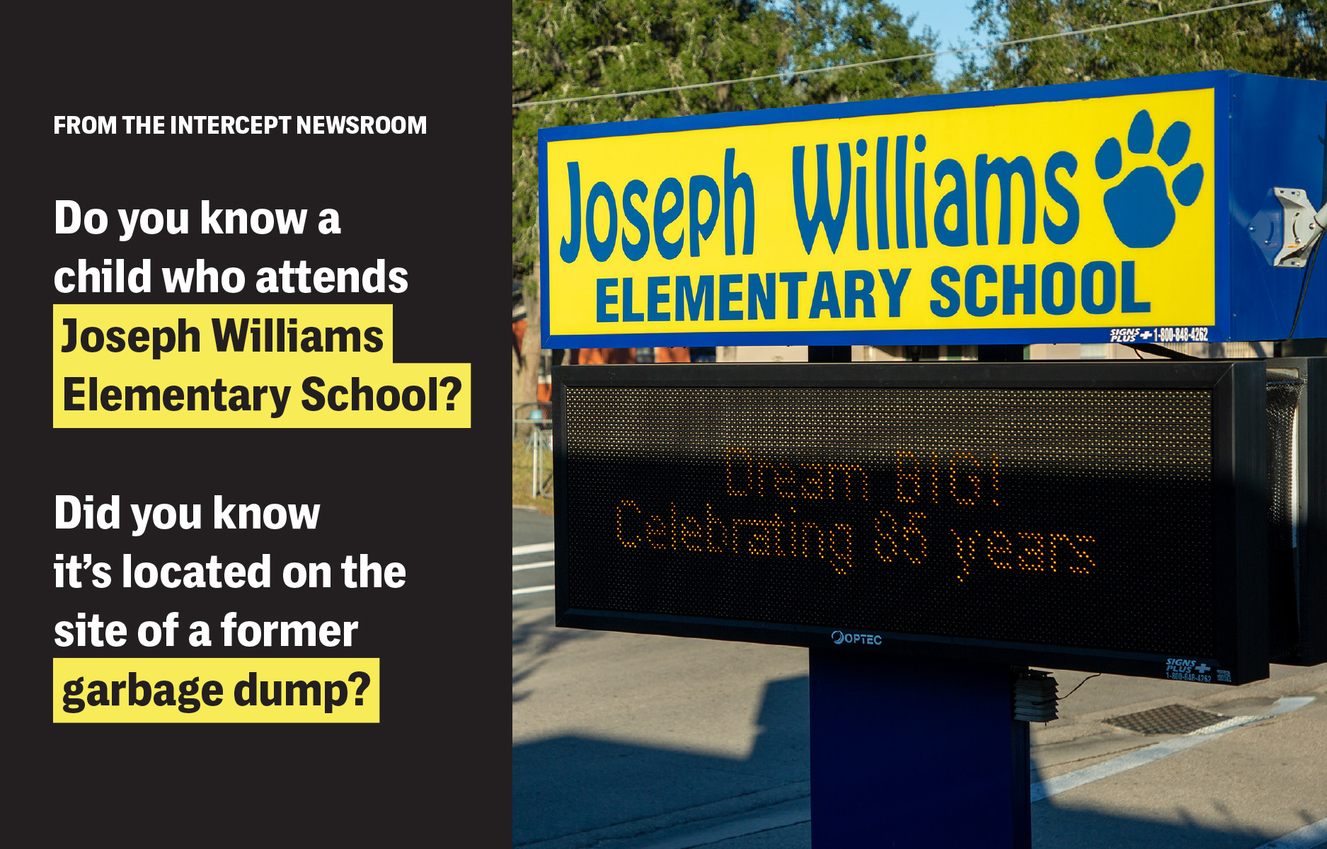 The Alachua County School District cleaned up some of the soil at the contamination site and told The Intercept the school was safe. With neither the county nor the state committing to a full cleanup and comprehensive study of the former dump’s impact on the school, we felt a responsibility to inform the local community what was happening at Joseph Williams Elementary. The above postcard was sent to 5,000 homes in Alachua County with key details about our story, contact information for the Alachua County School District, and a QR code linking to the full investigation.